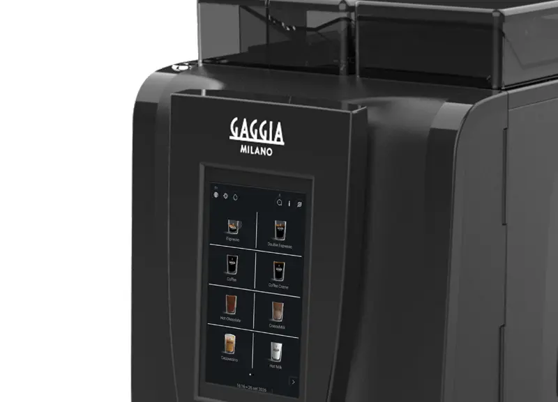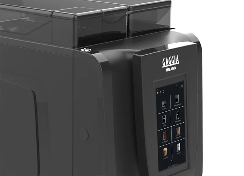 - Pantalla táctil de 7” que guía al usuario de forma intuitiva y eficiente durante la selección de bebidas.